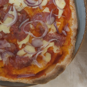 San Marzano Tomato Sauce, Fiordilatte Mozzarella, Finocchiona Salame, Red Onion -