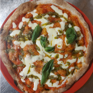 San Marzano Tomato Sauce, Fiordilatte Mozzarella, Parmesan Cheese, Pesto alla Genovese